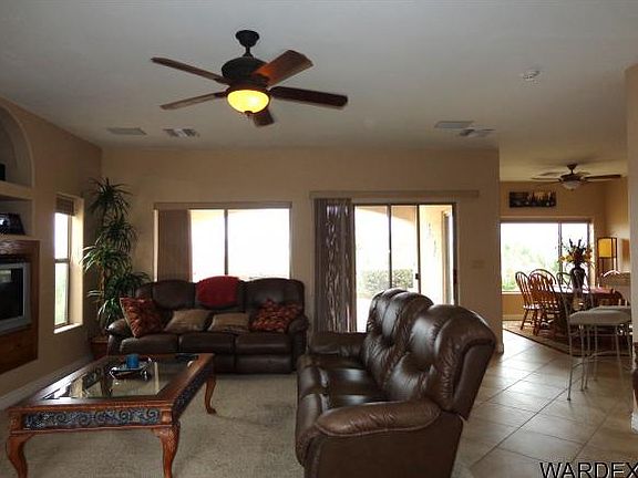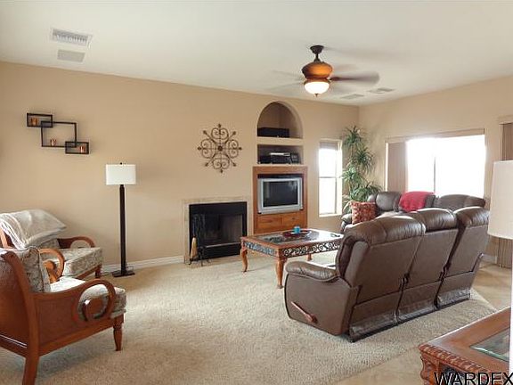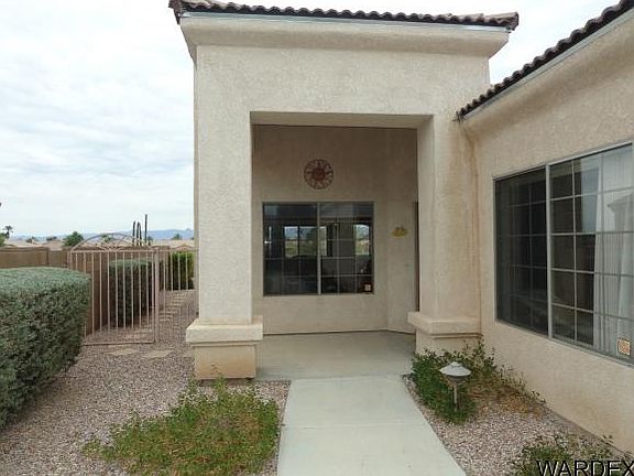 Right on the 14th Fairway! Bright & Beautiful 2 bedroom 1.75 bath home. All the finishing touches are done. Tile counters, and flooring, light sandy toned accents, wood burning FP, entertainment niche, Spacious open 1 level plan with den/study. Attached boat deep garage, rear fencing. Right on the green, short distance from the relaxation of the community pool & tennis. Scenic mountain views! Stay fit with a golf routine and great entertainment minutes away! Adjacent from the AVI Resort & Casino. HOA $315. quarterly.
