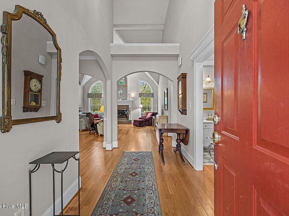 Step onto the welcoming covered front porch and inside to gleaming hardwood floors that flow through the main living areas. The dramatic two-story Great Room is the centerpiece of the home, featuring a cozy gas fireplace, built-in wet bar, and expansive windows overlooking the course & formal dining room. The spacious kitchen, complete with a center island, quartz countertops, and picturesque window views of the green.