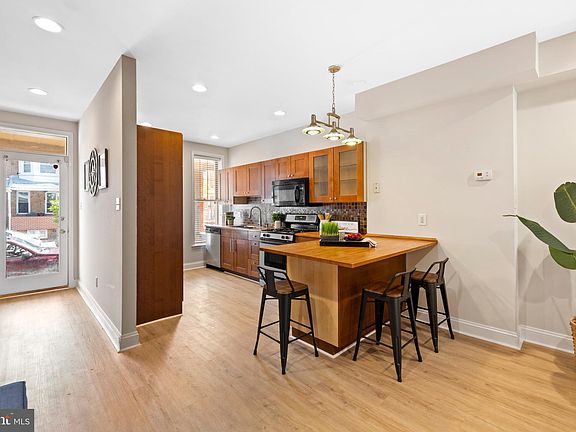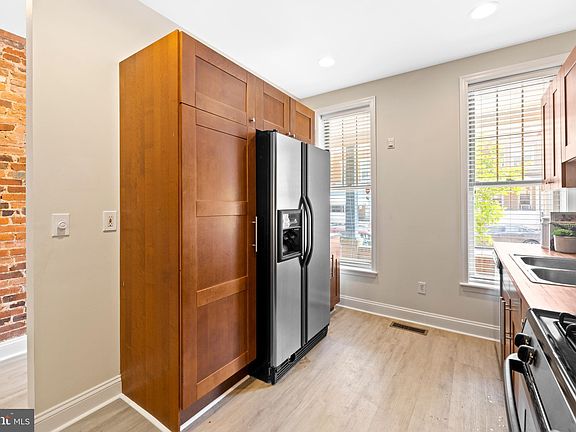 Welcome to 1406 South Carey Street – This renovated Pigtown porch front rowhome offers over 1200+ sqft of living space, 2 bedrooms, and 2 full bathrooms! This 14ft wide home features an open and bright floorplan on the main level. Newly installed LVP floors, fresh paint, and exposed brick highlight the large living and dining rooms. The spacious kitchen offers plenty of storage, a breakfast bar, stainless steel appliances, and a unique butcher block countertop. The upper level features a primary suite with a private bath, large closet, tall ceilings, and a bump out window. Additionally, you will discover a full bathroom in the hallway and a guest bedroom at the rear of the home. Both bedrooms feature new carpets and fresh paint. The lower level is unfinished and provides plenty of additional storage along with laundry hookups. The rear yard is home to a garage that can protect your car, motorcycle, or bicycles from the weather. This quiet location in the neighborhood has easy street parking and is extremely accessible to I-95, I-295, Downtown, University of Maryland, MARC trains and Light Rail.