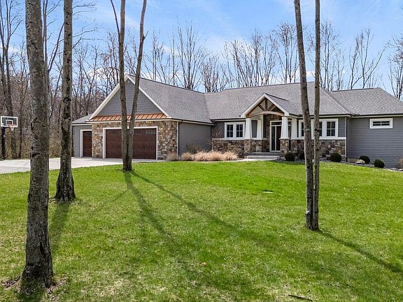 Luxurious Custom Home on 10 Private, Wooded Acres. Discover the perfect blend of elegance, comfort, and natural beauty in this exquisite 6-year-old custom home by Preston Allen. Nestled on 10 serene, wooded acres, this 4-bedroom, 4.5-bath residence offers nearly 5,000 sq. ft. of beautifully crafted living space. Step into the heart of the home—a gourmet kitchen featuring a massive 10-ft quartz island, high-end custom cabinetry, and a spacious butler’s pantry. Architectural details like coffered ceilings, cedar beams, and cathedral ceilings infuse warmth and character throughout. Designed with functionality in mind, the split-bedroom layout includes the potential for a main-floor in-law suite. Walls of expansive windows flood the living areas with natural light and offer breathtaking views of the surrounding forest—best enjoyed from the inviting 3-season room with Eze-Breeze windows. Modern amenities abound: 3-zone climate control, in-floor radiant heat in the primary bath, a brand-new tankless water heater (2024), whole-house water filtration, and an extra-deep well for superior water quality. Additional highlights include a vaulted space under the front porch—ideal for a safe room, canning area, or extra storage—and all appliances convey, including an additional washer, dryer, and deep freezer on the lower level. The oversized 3-car garage (1,092 sq. ft.) is equipped with two floor drains, a mop sink, and softened hot/cold water hose bibs. Outdoor features complete the package: a 30’ above-ground pool (with a new liner ready for installation), a fire pit, trampoline, and a custom play area with a zip line, rock wall, and swings. Deck ledger boards are already in place, ready for your future deck addition. This exceptional property offers a rare combination of luxury living, total privacy, and peaceful natural surroundings—move-in ready and waiting to welcome you home.
