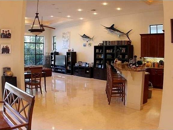 Custom Mediteranean Waterfront Home with Atlantic Ocean access in exclusive gated waterfront community located safely at the end of cul-de-sac. This elegant home features exquisite soaring cauffered ceilings with spectacular floor to ceiling windows that bring the Florida sunshine in, 8' doorways and higher archways with impressive crown moulding throughout. 3BR/Office=Den/3.5Bath/3 Car Garage. Gas Stone Mantle Fireplace and outdoor stainless steel grill. Kitchen features stainless steel appliances; 6 gas burner stove, double ovens and a brand new giant stainless steel refridgerator. Beautiful Jerusalem tile in entry, dining, livingroom/great room, kitchen, hallways and even the laundry room areas. Bathrooms feature marble floors and walls. Bedrooms and den have dark handsome hardwood floors. Master suite over looks Private Pool/Spa/Patio/deck/dock and water through magnificent French Doors, it also has double walk in closets, double vanities, private bidet area, marble boxed Jacuzzi oversized tub and dramatic Roman Shower complete with marble walls. Construction Type: Concrete Block, Concrete StuccoBRAND NEW: Upgraded marble walls in spectacular Master bath Suite complete with marble Roman shower and marble boxed Jacuzzi oversized tub. Stainless Steel Refridgerator, Washer, Main A/C Unit.Pet Friendly HOA: Cares for Lush Tropical Landscaping Maintenance including Private Pool/Spa, porch/patio/deck/dock (with motorized Lift/Hoist/Davit) and common areas.