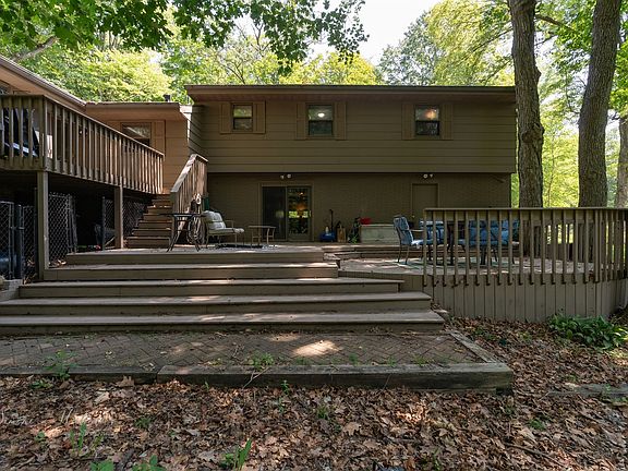 Welcome to your Beautiful Nature-Loving Oasis !! Private Road entry leads you back to the House, one of 7 in this Fabulous Secluded Area. Upon entering this home you will feel Warm and Welcomed by this Open and Inviting Living Room ~ Dining Room Combo, Soaring Ceilings, Large Open Kitchen with Corian Countertops, Abundant Cabinetry, and a Beyond Stunning 4 Seasons Room with Massive Windows to view the Multiple Tiered Decking Levels, Patio. Chicken Coop, and beyond Amazing Nature Views. The Upper-Level Boasts 3 Good Sized Bedrooms, a Hall Bath, and a Generously Sized Master Bedroom with a Master Bath. The First Lower Level that leads from The UpStairs Living Area Contains a Large Family ~ Open Sitting area for Walk-out Lower-Level Entertaining. Not to be outdone there is an Additional Lower Level that is currently used as a Family Theatre Area with Built-ins, including a Storage Room, Laundry, and Large Mechanical Storage Area. Newer Roof 2007, Electrical Service upgrated in 2007, and an Abundance of Storage! Only 6 minutes from Farm and Fleet, Rivian, Walmart, Restaurants, Hotels, Shopping, Fueling, and Convenience.