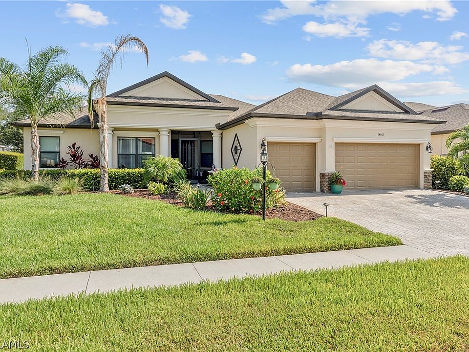 UPGRADED, ESTATE POOL + SPA HOME IN PORTICO. Located on a quiet cul de sac in phase 1 of the community surrounded by estate homes and a short walk to the community center/mailboxes gives you the feeling of having your own private 18 home community within. Arguably the best kept secret its easy to see why this is a rare find! Built in 2019, this is Lennar’s Oakmont II model in their estate home collection that is no longer being constructed in the community. Offering over 2300 sqft with an open floor plan layout the private dining room can easily be converted to either another office space or even a 5th bedroom possibly! Featured upgrades include crown molding throughout with 5.5 inch baseboards, screened front porch, luxury cabinet hardware matching throughout, insulated 3 car garage doors with epoxy flooring, custom pool/front yard lighting, 8 ft doors , 11ft. recessed ceilings in primary and living areas, custom black out shades for pool sliders, special drapery throughout, custom built in shelving/niches, extended lanai and much more over $34,000 worth! The pool/spa area is perfect for entertaining or just relaxing. A detailed property feature brochure also available upon request. The community’s location is in the River Shores District of Buckingham/Fort Myers so close to all the amenities of the river and Downtown river district yet still flood zone X, meaning no flood insurance requirement! If you are ready to start living the Southwest Florida resort lifestyle, schedule your showing today!