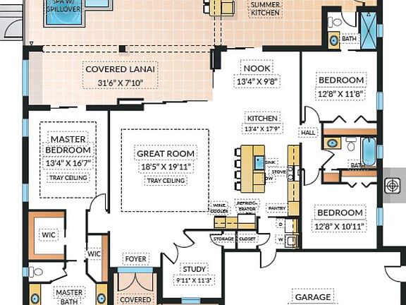 Designed to blend in with Florida's natural beauty, this house has 3/4 bedrooms, 3 full bathrooms and a private study that could also be a fourth bedroom.Your living room will be modern, spacious and filled with sunlight. It will have an open view of the backyard (or pool and spa) with 8 ft tempered impact glass sliders providing access to the lanai and summer kitchen, and there will be plenty of coverage to install an outdoor television and sound system. It's a perfect setting for relaxing or entertaining. The master suite offers double walk-in closets and leads to a luxury bathroom and carwash shower. The guest wing consists of 2 bedrooms and a full bathroom servicing both, plus a separate pool bathroom. The kitchen features a large pantry and an island capable of seating four. Just outside the kitchen is the storage and laundry room, which also leads to the attached 3-car garage. GreenBlock specializes in Cat 5 hurricane-safe homes. Ask about building this plan with ICF construction and other storm-safe selections.