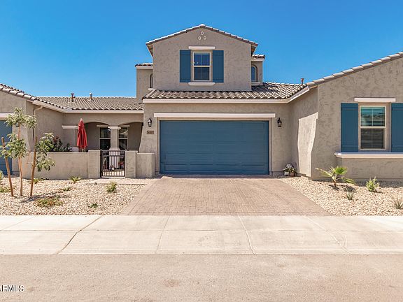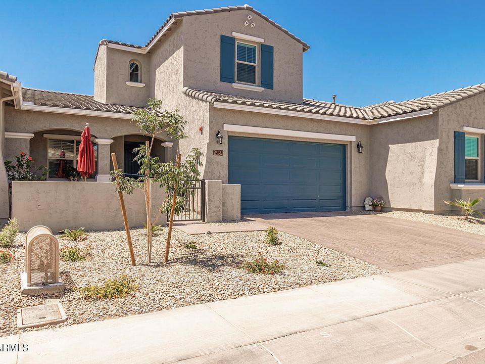 Beautiful, newer home in gated Palm Valley Golf course neighborhood, in highly rated school district! Come see this energy efficient Meritage home, half block to community pool. Over 51K in builder upgrades! Modern farmhouse decor with high ceilings, open floor plan and over 2524 sqft. Upgrades include extended wood-look tile throughout main living areas. Master suite on main floor with freestanding tub and decorative tile shower. Beautiful two-tone kitchen with Whirlpool gas 5 Burner stove, built-in microwave and upgraded cabinets. Designer kitchen layout w LED lightening under cabinets, quartz countertops, & large pantry. Versatile floor plan with two flex spaces: one on main floor and one upstairs. Private gated front courtyard with pavers and covered patio in backyard with pavers.