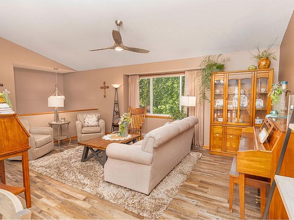 Welcome to this charming 4-bedroom, 2-bath home that combines modern amenities with timeless appeal. The private backyard is a true retreat, featuring mature trees, beautiful gardens, and an in-ground sprinkler system for easy upkeep. Enjoy outdoor living with a maintenance-free 12x14 upper deck, perfect for relaxing, and a spacious 16x16 lower patio ideal for entertaining. Inside, you'll find a cozy fireplace, a modern kitchen with granite countertops and stainless-steel appliances, along with new paint, new lighting, and a new water softener. Luxury vinyl plank flooring enhances the entry, living, dining, and kitchen areas. Built to last with steel siding and a 30-year roof, this home is truly move-in ready!