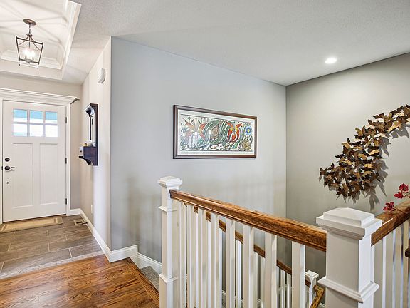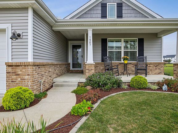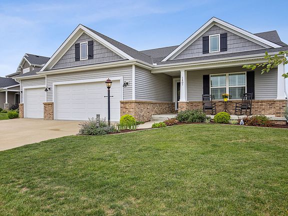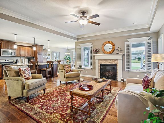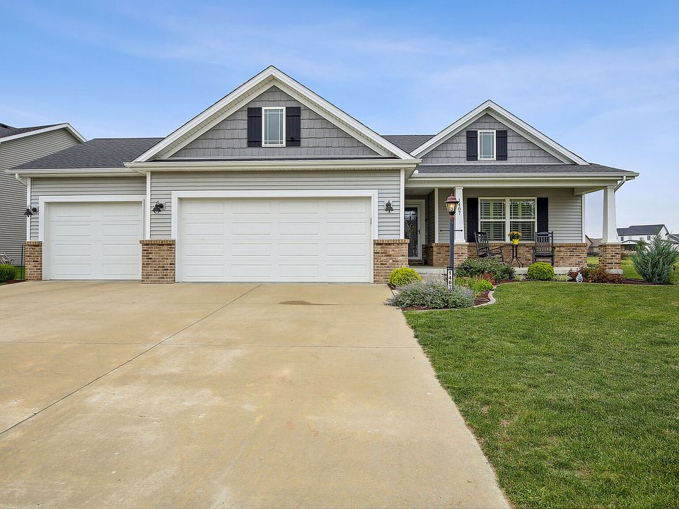 Beautiful ranch-style residence boasts an expansive open floor plan, comprising 4 bedrooms, 3 full baths, a 3-car attached garage, and a fantastic finished basement. A charming porch and a tiled entryway with a closet warmly welcomes you. As you step inside, you'll be greeted by the splendid great room, adorned with hardwood floors and a fireplace framed by large windows. The hardwood flooring extends seamlessly into the eat-in kitchen, complete with an island for casual dining. Adjacent to the 3-car garage, you'll find a convenient laundry room equipped with lockers and tiled floors. The master suite is generously spacious and includes a walk-in closet, while the master bath offers the luxury of dual vanities and a tiled shower. Downstairs, the finished basement features a vast recreational room, a fourth bedroom, a full bath, and abundant storage space to cater to your needs! Outside, you'll have unbelievable sunsets over your lake while sitting in the screened in porch or sitting under the pergola with brick patio. This is a rare find with all this home offers so let's make it yours today.