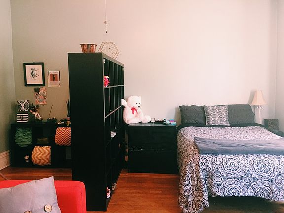 This apartment has lots of charm! Built-ins, wood floors, stained glass windows in the common areas, and beautiful woodwork. Though this is a studio, there is a large eat-in kitchen. There is a washer/dryer in the building for residents' use.