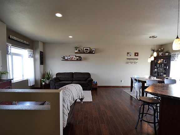 This is not your cookie cutter split entry home. This is a beautiful home with unique features and angles setting it apart from the rest. The home has 4 bedrooms, 3 bathrooms and a finished triple stall garage and is located on the edge of city limits providing a rural feel with great views and no backyard neighbors. The entrance includes a coat closet and the gorgeous wood stairs lead you to the main floor where there is a spacious and open concept living room, dining room and kitchen with lovely hardwood look laminate flooring. The kitchen has great features with a pantry closet, a large sit up island, high definition counter tops, soft close drawers and stainless appliances. You can access the deck and backyard through the patio door from the dining room and enjoy great views of the wide-open prairie. The main floor also has a master suite with walk in closet and master bathroom, a large second bedroom, a full bathroom and the desirable main floor laundry room. The lower level has a rustic feel with its unique finishes and includes a large family room with plenty of space for recreation along with two more bedrooms and a third bathroom with a beautiful tiled shower and solid wood doors. The three-stall garage is sheet rocked and insulated, has hot and cold water and a floor drain. And you will enjoy the great outdoors at this property whether it is from the deck that includes views of the Fort Lincoln block houses or gathering in the large backyard which includes a playset and garden plot.
