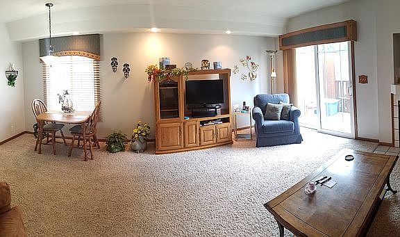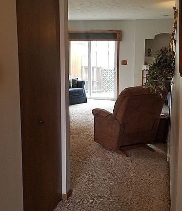 - Living Room: Fireplace, Carpet, Sliding Glass Door