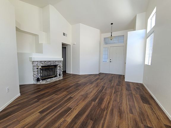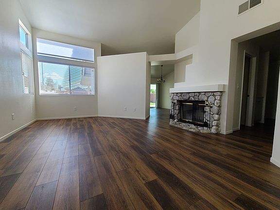 Lovely Single-Story 2-Bedroom Home in Beaumont! A Charming Stone Fireplace in the Living Room, and beautiful white cabinetry in the Kitchen and adjoining Dining Area. Laminate Wood Flooring throughout most of the home and New Vinyl Plank Flooring in the Bedrooms. New Paint throughout and Central AC/Heat. The Kitchen includes New Quartz Countertops, a Stove/Oven (gas), and Dishwasher. There are also Washer/Dryer Hookups in the garage. The Two Sliding Doors open from the kitchen and primary bedroom onto a Spacious Covered Patio, and the Large Fenced Backyard has been Newly Landscaped. Gardening Provided! No Pets Please.