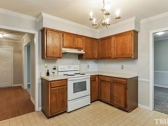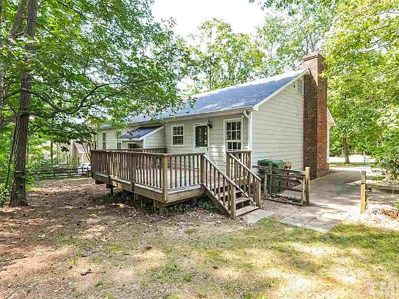 This Cary one-story home offers a covered front porch, a fireplace, a deck, and cultured marble master bath countertop.