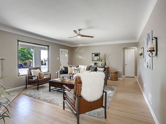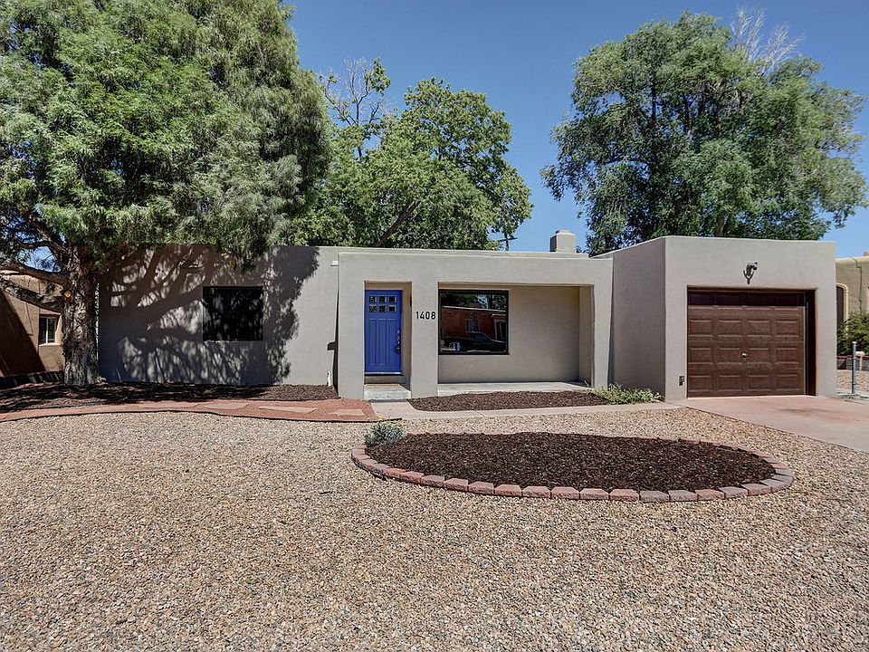 All the contemporary updates you want with 50's charm including cove ceilings & front picture window. 2 master suites both with updated bathrooms. Main master has double glass top vanity with glass bowl vessel sinks, & large walk in closet. Kitchen has new cabinets, ample granite counters, gray, subway tile backsplash, stainless steel appliances including a 5 burner stove & vent hood. Beautifully finished Hardwood floors in living & all 4 bedrooms. Kitchen, dining & bathrooms have large format custom tiles. New refrigerated ac/heat combo unit, tankless hot water heater, & thermal double pane windows for energy efficiency. Large fully landscaped backyard with covered patio, & mature trees for summer BBQs. Centrally located with easy I-40, Uptown & UNM access.