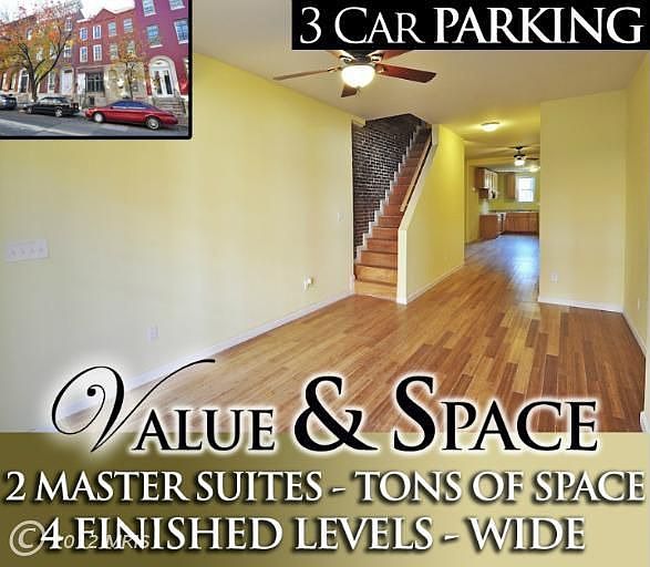 SPACIOUS ROWHOME WITH 4 FINISHED LEVELS & 3 CAR PARKING! Hardwood floors throughout, half bath on main level, living room w/ exposed brick, dining room, large eat-in kitchen, spacious Master suite w/ walk-in closet & full bath, 2 large bedrooms and 1 full bath on 3rd level, large finished basement with 2 rooms and oversized parking pad for up to 3 cars! Current taxes just $71.40/yr!