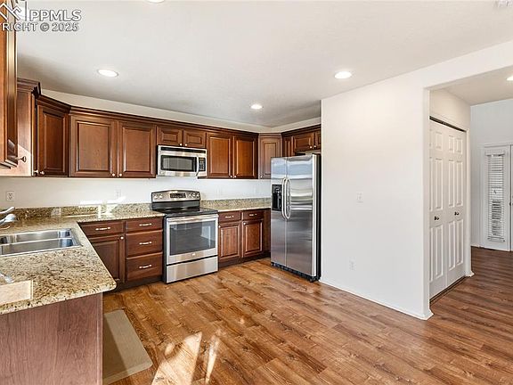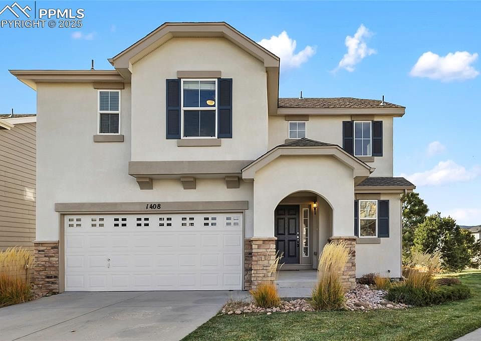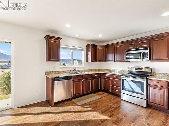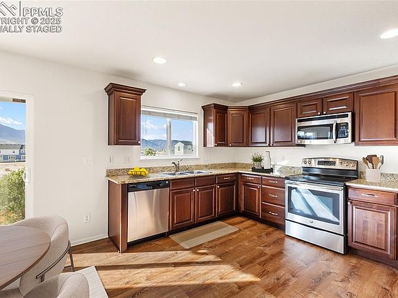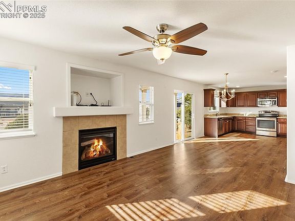 Breathtaking Views from Nearly Every Room! Welcome home to this stunning property where Colorado’s natural beauty takes center stage. Enjoy sweeping, views of Pikes Peak from almost every room in the home! The main level showcases gleaming Rustic looking floors, an open and functional floor plan, a cozy living area complete with a ceiling fan and gas fireplace — perfect for relaxing evenings. The eat-in kitchen features stainless steel appliances, granite countertops, a pantry and an abundance of rich Mocha cabinetry, and a dining nook with walk-out access to the patio & backyard. Upstairs, the spacious primary suite offers a true retreat, complete with a three-sided fireplace, generous sitting area, large walk-in closet, and a luxurious five-piece bath. Two additional bedrooms on the upper level provide plenty of space for family, guests, or a home office. The HOA covers lawn maintenance and trash removal. Located just steps from a neighborhood playground and conveniently close to I-25, this home offers easy access to Denver (approx. 45 minutes) and Colorado Springs, as well as nearby shopping, dining, entertainment, and top-rated D-38 schools. Experience comfort, style, and those unforgettable Pikes Peak views — every single day.