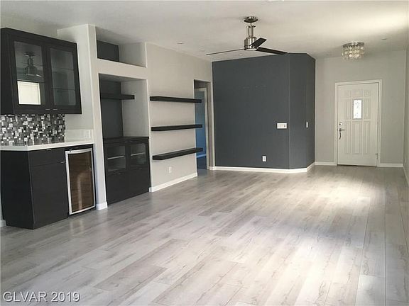 Spacious open floor plan. Custom designer kitchen with quartz counters, waterfall island. Recessed lighting throughout kitchen, living room and master bedroom. Beautiful designer features include grey tone laminate flooring in living areas, porcelain tile in baths and carpet in two of the three bedrooms. Porcelain tile showers in both bathrooms. Custom shelving, entertainment unit and bar. Triple slider off master to pool. Custom master closet.