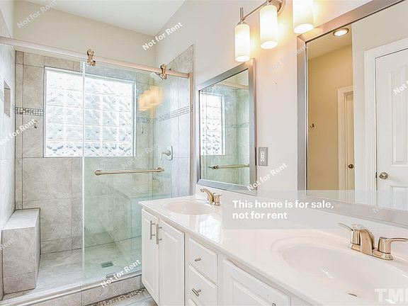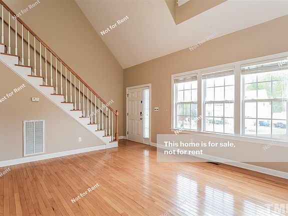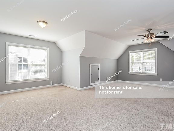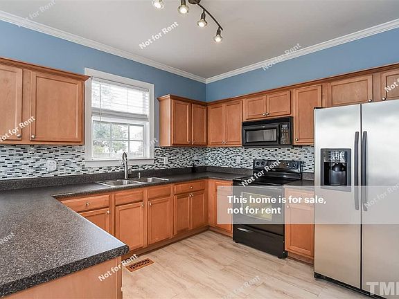 This Garner two-story home offers a gas fireplace, vaulted living room ceiling, sunroom, office, kitchen breakfast bar, master bathroom dual sinks, separate tub and shower, open patio, deck, and a two-car garage.
