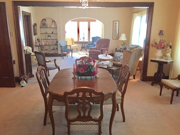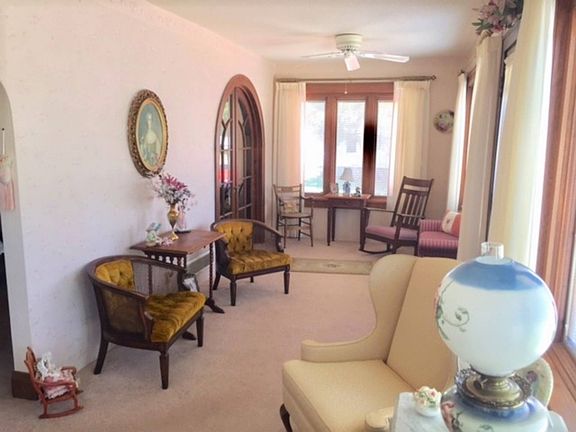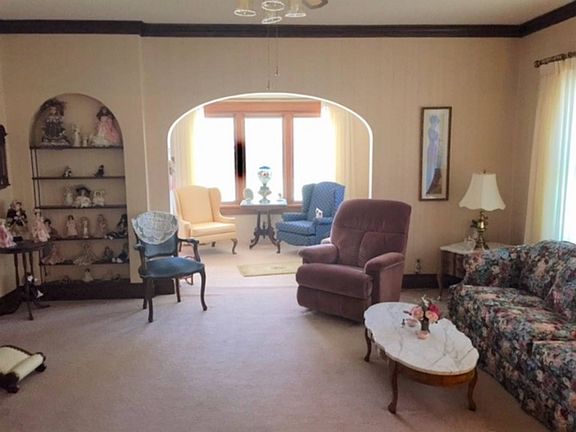 CLASSIC BRICK BUNGALOW on over sized lot close to school. Entrance: Elegant entrance is insulated and has new pella windows. Great light classic oak woodwork. Arched entrance to living room and arched french doors to bedroom. Living Room: cream walls, neutral carpet. Massive oak woodwork. Arched shelving, open to dining room Dining Room: more oak woodwork, classic lighting, neutral carpet, cream walls Kitchen: oak cabinets, vinyl floor, new dishwasher, range and refrigerator included. Kitchen has breakfast nook that is drenched in sunlight and views the nice back yard. Bedroom: natural woodwork, plush carpet, large closet Bedroom: Natural woodwork, plush carpet, french doors with arched top open to entrance room, closet Bath: classic pink tile with arched accents in the tub/shower and in commode area. Lower Level: This basement is very high elevation. Perfectly dry and has good lighting from it's large windows. The north side of the basement is divided into three rooms: one is a "man cave" with bar, tv area, painted walls, double closet (which could be a bedroom). There is a bath in the basement level with shower, commode and vanity. Finally another bedroom with tongue and groove walls, carpet floor and closet. Under the porch is additional room for hobbies with work bench, good lighting and painted walls. The rest of the basement is a large open room with painted walls, appliances included: washer, dryer, freezer, even a stove and refrigerator to do summer canning. Back: over sized lot has 2 1/2 car garage with cement drive and extra parking area outside the garage. Privacy fence. Area west of garage for garden or storage of boats, etc. code 240 RE tax: $3106. 06092017