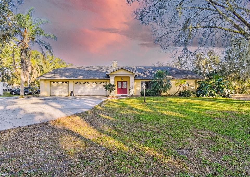NEW ROOF JUST INSTALLED MARCH 2023! Welcome to this beautiful 4 bedroom, 3 bathroom, 2,585 Sqft, saltwater pool home sitting on 1.8 acres of land. The long driveway leads you to the attached 3 car garage of this home. When you step into the home you are greeted by a spacious open floorplan. The living room measures at approx. 20'x36' and features a gorgeous fireplace. This room is perfect place for entertaining friends and family. The open kitchen has a built in oven, side by side refrigerator, and a large island with plenty of room for sitting. The large master bedroom measures at approx. 18'x14' and has a beautiful master bathroom with dual sinks, a garden tub, and a private toilet room. The backyard has a large screened in patio with a beautiful in ground pool. The icing on the cake is the detached 2 car garage with workshop space and it's own bathroom! NO HOA & NO CDDs. The drainfield and septic dosing tank was replaced Dec. 2022. With everything home has to offer, there are so many possibilities of what you can do here. Near I-4, approx. 15 mins to Lakeland, 30 mins to Tampa, 35 mins to Wesley Chapel, and 1 hour to Orlando. Call us now for a private tour of this home!