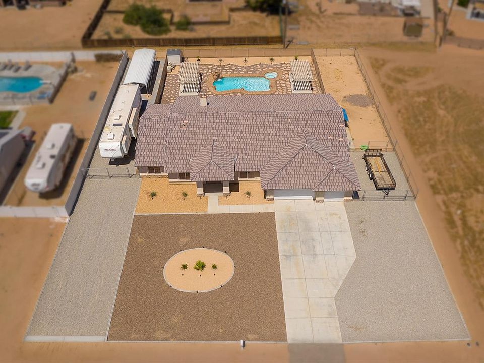 Welcome to your own Paradise in this custom built home designed for relax living! Come enjoy your beautiful pool with rock waterfall & spa! Plenty of shade with 2 detached covered patios on each side of pool plus the attached covered patio right off the house. Nice shed to keep all your pool equipment out of sight! Fully fenced back yard with 2 separate side yards fenced off. Low maintenance desert landscaping on auto drip system so you can enjoy the better things in life! This 4 bedroom, 4 bath, 3122 SF home built in 2004 has 2 master bedrooms with walk-in closets, one on each side of the home with own doors leading to the back yard! Both master bathrooms have separate shower & soaking tub. Great room has vaulted ceilings & corner fireplace. Kitchen has breakfast nook & bar, center island, walk-in pantry & double ovens. Formal living/dining room is currently being used as a Game Room! Ceiling fans thru-out. Alarm system. In-door laundry room with storage cabinets & sink. A/C unit plus evap cooler! Attached finished 3-car garage with work bench, shelves & automatic openers on both doors. RV access and carport! This home has everything on your list, so hurry to put in your offer!