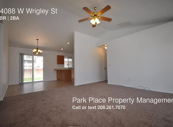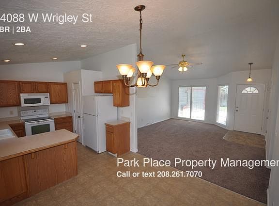 SCHEDULE A SHOWING ONLINE AT: showmojo.com/lh/7f48ad202a Welcome home to this beautiful 3 bedroom, 2 bathroom + Bonus home. It's located off of Eagle Road, but is perfectly nestled away from the hustle and bustle. It's near shopping, dining, and the West YMCA. This home offers a great floorplan! The dining and living area are open to each other and the kitchen is tucked back. The kitchen features a dishwasher, microwave, stove/oven, disposal, and pantry! It even has a breakfast bar! *FRIDGE NOT INCLUDED* The bonus room is perfect for a craft room, play room, office, etc! The master bathroom features a walk-in closet, dual-sink vanity, and hollywood lights! Inside the bathroom is also a walk-in closet. The secondary bedrooms are located on the opposite side of the home. They share a guest bathroom. Each room is large in size with ample closet space. There is also a laundry room with washer/dryer hookups. The backyard is large; it offers a patio, RV parking with new rock, and fencing for privacy. For questions please call (208) 377-3227. *This information is deemed reliable but not guaranteed. Renter is to verify all information (photos similar). Security Deposit: 1300 Parking: 2 Car Garage Lease Length: 12 month Subdivision: Candlestick Park Nearest Cross Street: Eagle & McMillan Square Footage: 1414 Virtual Tour: Date Property Available for Viewing: 2016/7/29 House Number: 14088 Bathroom: 2 Bedrooms: 3 Pets: Service or companion animals only Utilities Included: none Price Specials: none Balcony Deck Or Patio Boise Bonus Rec Room Disposal Dual Sink Vanity Fridge Not Included High Vaulted Ceiling Laundry Area Inside