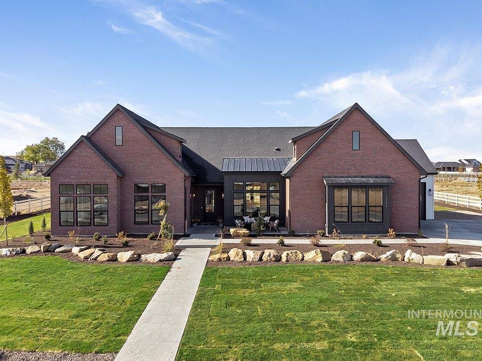 'THE CLIFDEN' by Tamarack Construction spotlighted in the 2022 Canyon County Fall Preview of Homes! Situated on a one-acre lot in desirable new home community, Lone Star Ranch. The exquisite exterior flaunts red brick, black trim windows, front courtyard & large covered rear patio. Soaring vaulted ceilings, beautiful wood beam and brick accents, European-style knotty alder shaker cabinets, stainless steel Thermador appliances, waterfall edge island, overstated butler’s pantry, and more. Private owner's suite with gas fireplace & old world spa bath boasting heated floors, freestanding tub, frameless glass walk-in shower, separate vanities, large walk-in closet with laundry access. Side-load garage with room for all the toys. Make sure to check-out the 3D virtual tour!