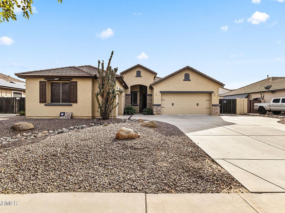 This one-of-a-kind 4-bedroom, 2-bath home in Surprise sits on a rare dual lot and is designed for comfortable family living. The beautifully landscaped desert oasis offers space to relax, play, and entertain. Inside, fresh interior paint and a well-designed split floor plan provide privacy, with an oversized primary suite separated from the secondary bedrooms. The spare bathroom features a true ADA-compliant roll-in shower. The main AC unit was replaced last year and includes an assumable warranty. Storage is abundant with garage ceiling racks, a solid storage shed, and two garages providing parking for three vehicles. A truly unique home offering space, function, and flexibility.