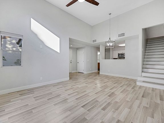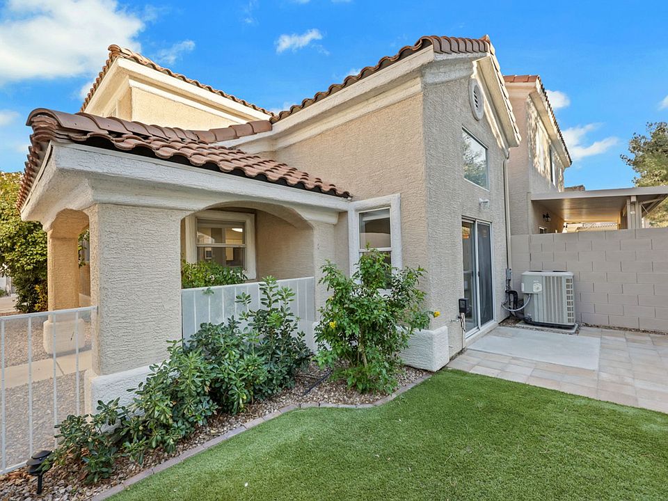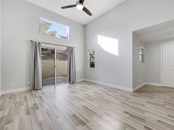 Welcome Home! Completely remodeled two-story single-family home with two primary suites, 2.5 bathrooms, a two-car garage, and a community pool & spa, located in west Las Vegas near Summerlin amenities. The main level features an open living and dining area with vaulted ceilings, updated flooring (no carpet!), and abundant natural light. The remodeled kitchen offers white cabinetry, stainless steel appliances, modern finishes, and opens directly to the living space. A downstairs powder room includes an updated vanity and fixtures. Sliding doors from the living area lead to a private, fully enclosed backyard with low-maintenance landscaping and patio space. Upstairs, both primary suites include private ensuite bathrooms and closets with built-in shelving. Bathrooms are finished with custom tile surrounds, updated vanities, and modern fixtures. A dedicated upstairs laundry area is centrally located between the suites. We are looking for at least 650 credit, $5k income and no less than 2 excellent landlord references.
