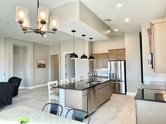 Immaculate Home - Brand New - Be the first to live in this house - Ready to Move in NOW! 11 foot Ceilings, 8 foot high Interior and Exterior Doors throughout, Beautiful Kitchen with Shaker Cabinets and Black Granite Countertops, huge Pantry with coffee bar area, Undermounts sinks throughout, Upgraded Appliances including Refrigerator, Tile floors, Carpet in Bedrooms and living room, Ceiling fans in all bedrooms and living room, Tiled wall in Living room that will fit a large TV, Large Tiled Showers, 12 ft x 8ft sliding glass door in Living room, fully landscaped, Stained Stamped Concrete on driveway and back patio. Side yard is large enough for a pool or spa. Partial View of the Mountains from the front yard. Furniture, Accessories, all TVs including 82" TV in Living room, refrigerator and kitchen small appliances and pots and pans are all INCLUDED !! This community will also allow VACATION/ Short Term Rentals.