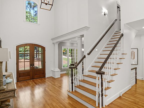 Welcome to 1409 Caistor Lane. This stunning custom estate home is nestled on a nearly 1 acre lot featuring mature trees and plantings. Step inside to find extensive millwork, 10 ft ceilings & gleaming hardwoods throughout most of the home. Upon entering the home, you will find the 1st floor office featuring wainscoting, coffered ceiling & French doors. Across the open foyer is the gracious formal dining room equipped for large gatherings. The sun-filled 2 story family room includes a dramatic wall of windows & a gas log fireplace with stone surround flanked by custom built-ins. The recently renovated kitchen pairs timeless quartz countertops with a clean tile backsplash & stainless steel appliance package featuring double ovens & a gas cooktop. The keeping room is a cozy retreat with vaulted & beamed ceiling & an additional gas log fireplace. The first floor primary suite boasts 2 walk in closets, double trey ceiling, plantation shutters, a deep whirlpool tub and separate walk in tiled shower. The lower level offers unlimited possibilities. The basement's ample space allows for storage, fitness, and play, all in separate rooms. In addition, you'll find a kitchenette/bar area with custom cabinetry, and granite countertops + your very own wine/bourbon cellar. Relax on the lower level screen porch or the expansive back deck with fantastic panoramic wooded views. Rest easy with peace of mind knowing all three HVAC's are new as of 2019 as well as a new roof in 2022. Located within the established Moorlands neighborhood, this property offers seclusion while maintaining convenient access to North Raleigh retail and dining, easy drive to RDU airport, with strategic positioning for commutes throughout the greater Triangle region including downtown Raleigh, Research Triangle Park, Durham, and Wake Forest. Come see your future home today.