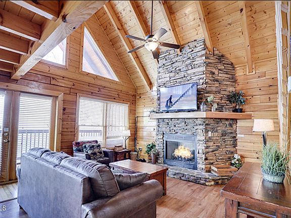 VIEWS! VIEWS!! VIEWS!!! This amazing 4 bedroom cabin has TWO master suites, one with its very own jacuzzi tub and cozy fireplace! The cabin also boasts 3 full bathrooms, and two separate rec rooms for gaming fun to give everyone in the cabin something fun to do! One has movie theatre seating and a new queen sleeper sofa for movie nights along with a fireplace. Take in the gorgeous views from the hot tub on the deck or watch your favorite game on the TV all while taking in the ambience of the Smoky Mtns! This money maker is in an amazing location and would be an awesome retirement plan-let it pay for itself!