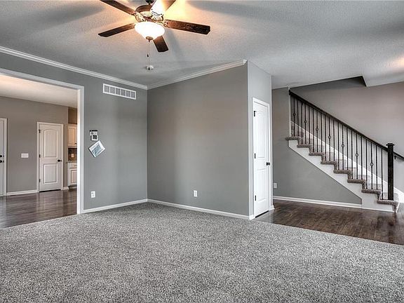 Introducing the "Camden" by Robertson Construction!  A beautiful 2 Story with an inviting front porch!  The Main Level features a Gas Fireplace, Spacious Kitchen and Breakfast Room both with HARDWOOD Floors, Solid Surface Countertop, Kitchen Island, Custom built Cabinets, Pantry, Stainless Appliances and a Half Bath.  The Second Level has a spacious Master Bedroom and Master Bath with double vanities, soaker tub and a separate shower along with a Walk-in Closet. Over-sized 4th Bedroom.  Laundry is conveniently located on the Second Level.  COVERED DECK. The Walkout Basement could be finished for additional living space.  Located in the highly-rated Kearney School District!