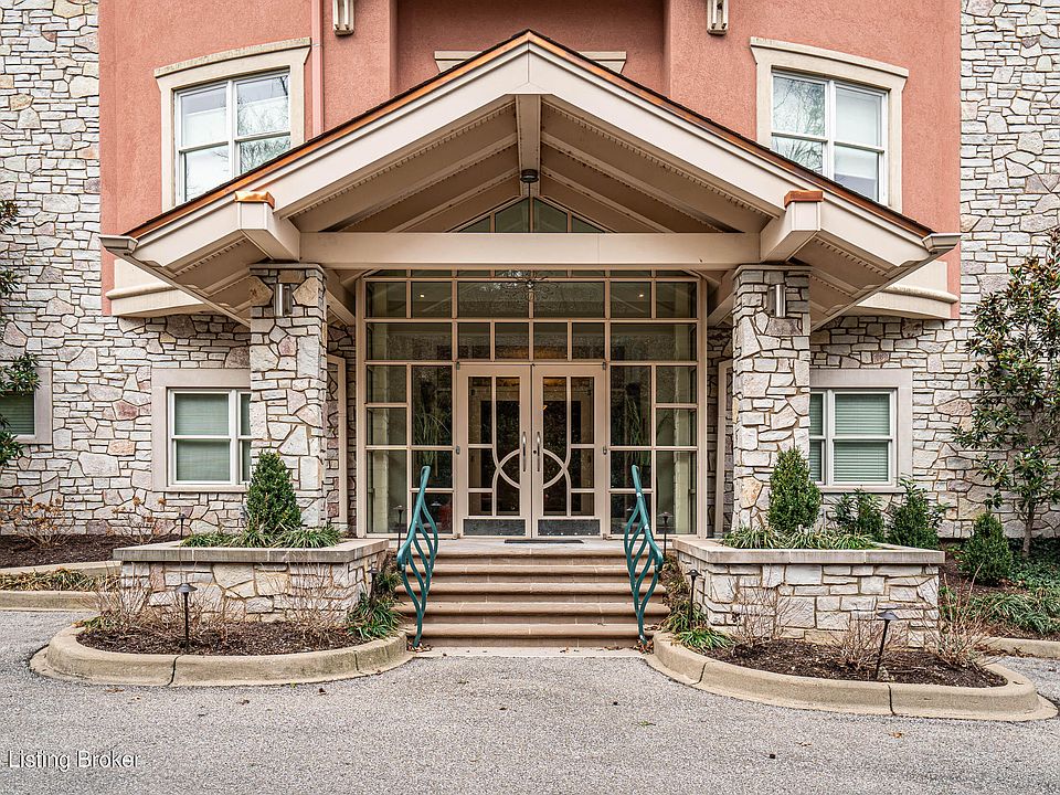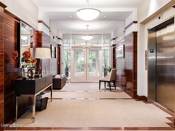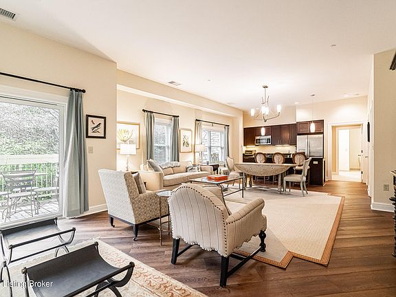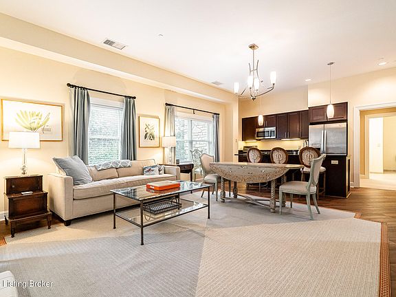 This stunning 2 BR, 2 BA first floor condominium with 10' ceilings is move-in ready and almost completely furnished. It was originally designed by Lee Robinson. The kitchen opens to the great room which has an abundance of natural light and private terrace/balcony. The large primary suite has two walk-in closets and an ensuite bath. The second bedroom is located at the opposite end of the great room providing great privacy. Separate laundry room with washer dryer to remain. Enjoy the amenities of this condo, including a heated garage with 2 designated parking spaces and private storage, an elevator, and fitness room. This luxury secure building is conveniently located off River Rd and Zorn Ave. in sought after Mockingbird Valley with easy access to I-71 and just minutes from downtown Louisville. The non-combustible steel and concrete construction is fully sprinkled. Pets allowed per bylaws. Gas, water and sewer are included in the maintenance fee. Electric average is $62.13 a month.