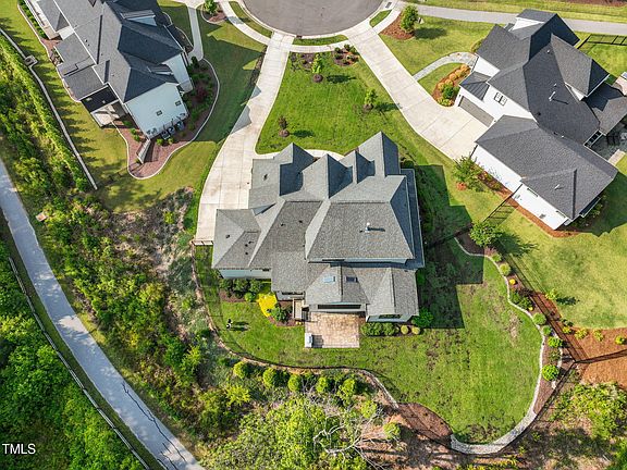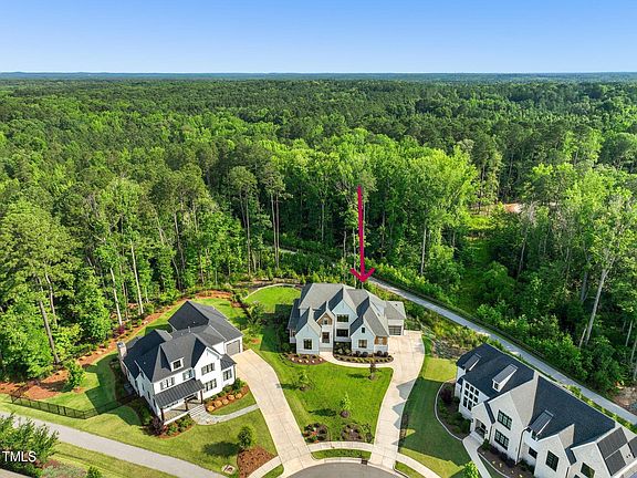 Experience unparalleled luxury in this stunning cul-de-sac home! Nestled on over half an acre. This home seamlessly blends modern sophistication with natural beauty, offering a serene retreat that backs to a protected wooded area. Impeccably designed with site-finished 5-inch white oak hardwood floors throughout, it features striking wood beams and soaring ceilings. Contemporary light fixtures and a sleek 60'' linear gas fireplace add to the home's chic ambiance. The open-concept layout is perfect for both entertaining and everyday living. The chef's kitchen is a culinary dream, boasting a 6-burner WOLF range, custom venting hood, double oven, sub-zero refrigerator, beverage fridge, and high-end cabinetry. The expansive island serves as a centerpiece for gatherings. The spacious First-floor primary suite is a sanctuary, highlighted by a stylish board-and-batten accent wall and a luxurious bathroom. Enjoy a spa-like experience with a stunning zero-entry shower, freestanding tub, double shower heads, dual vanities, and an oversized closet. A second first-floor bedroom or remote home office features 14-foot ceilings, a board-and-batten wall, a private bathroom, and a walk-in closet. For outdoor living, the incredible screened porch with a gas fireplace and the stone patio with a built-in Coyote grill are ideal for entertaining guests. Upstairs, find three generously sized bedrooms, each with walk-in closets and en-suite bathrooms, along with a large bonus loft area complete with a wet bar, fridge, and built-in shelving. Ample storage options include multiple linen closets, walk-in closets, and an unfinished attic space on the second floor. Additional highlights include a side-entry three car garage with epoxy flooring, a fenced yard, a convenient drop zone with cubbies and a bench, a spacious first-floor laundry room with additional hookups for a stackable washer and dryer, landscape lighting, and irrigation. Located with direct access to the Cary greenway which connects to 22.6 miles of the picturesque Tobacco Trail, this home offers both a peaceful retreat and easy connectivity to 540 and ample shopping and restaurant availability.