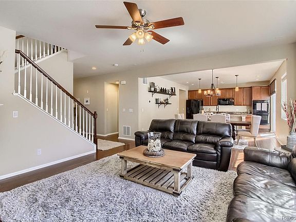 This immaculate Hemingway Model in Morningview sits on a quiet street just steps from Bison Park and the entrance to the hiking and biking trails at Ridgeline Open Space. Main level features a spacious office upon entry, solid hardwood floors, half bath and an open kitchen and living room fireplace and wired for surround sound. The open kitchen includes slab granite counters, black appliances, oil rubbed bronze faucet, large eat-in island, walk-in pantry, updated light fixtures, double oven and 42" cabinets. Upper level offers a huge bonus room with recessed lighting, 4 bedrooms with ceiling fans, newer carpets, laundry and full bath. The spacious master suite includes a 5 piece bath w/ slab granite counters and barn door, large walk-in closet and ceiling fan. New roof in 2016, radon mitigation system and a full basement with 1162 sf, ready to be customized to suit your needs. The backyard offers a stamped concrete patio w/ new shade trellis for entertaining.