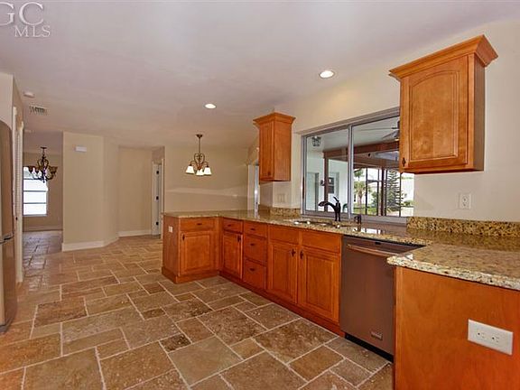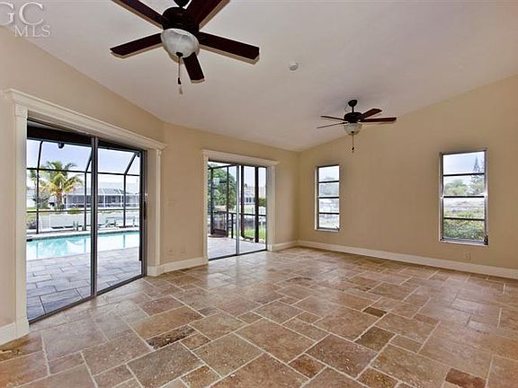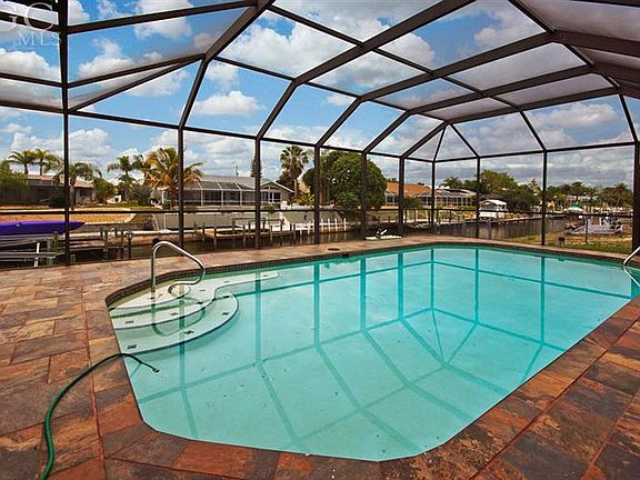 Newly updated Hacienda Villa style Pool Home. Every detail including features: From the Elegant Entrance doors to the Travertine Versailles Pattern flooring throughout home.The Classic Rosette, Fluted door Casing, and Plinth Combined with all new 2 panel classic doors. 5 1/4 New baseboards (all trim finished in a soft Dover colour) New Granite Kitchen counters and Toffee Kitchen Cabinetry. Frigidaire Gallery Stainless Steel appliances, Samsung Fridge and Range with new Whirlpool washer and dryer. New lighting and fans throughout. Both bathrooms have magnificent Shower in all Natural Travertine with new Granite dual vanity tops. Guest/2nd bath with dual vanity and new porcelain tile walls and frameless spotproof glass. New Sod front and backyard. All this located just a short boat ride to the Caloosahatchee River on a gulf access canal. Your own concrete dock (one bridge clear 11.25 ft) New Hurricane garage door. Brand new roof and newly resurfaced pool with city water & sewer assessments all paid, and much more. Easy to show Corporate Owned home.