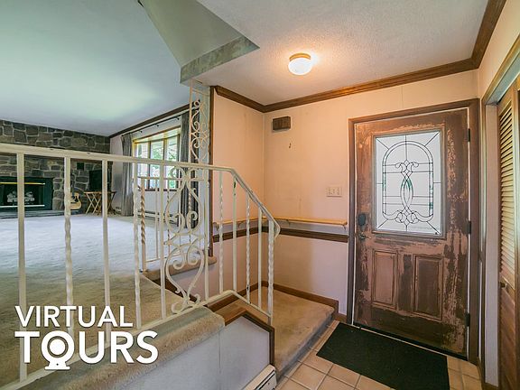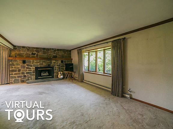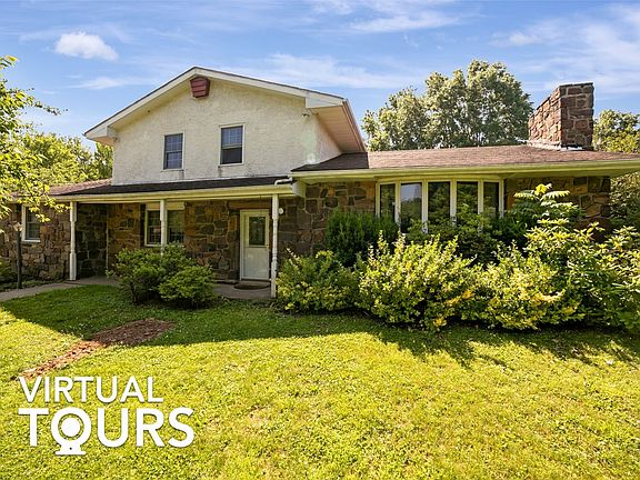 Spectacular 4 bedrooms, 2.5 bath and 2,384 square feet home situated on a sprawling 3.4 acres flag lot in a lovely neighborhood in Perkasie! This 1970-built home boasts unique design finishes and spacious living spaces throughout! Amazing curb appeal with lush landscaping, mature trees and impressive stone exterior warmly welcomes you to the property. Right off the entry of the home, you'll find the elevated living & dining areas adorned with carpet flooring, crown molding, wooden window trims, abundant natural light and a gas fireplace with floor-to-ceiling stone surround. The kitchen sits between the dining area and step-down family room, complete with ceramic tile flooring, rich wooden cabinets, sleek black appliances, granite countertops, pantry and a stainless double sink with yard facing windows. The expansive family room offers massive space for entertaining, showcasing dark wood paneling, high vaulted ceilings, wine bar with stained glass chandelier and stone counter, impressive stone wood burning fireplace, and double glass doors that exit to the rear yard. Rounding up the main floor is a powder room for guests and a bedroom just off the entry hallway, with laminate wood flooring, bright windows and a decent-sized closet. Upstairs, all remaining bedrooms have carpet flooring and ample closet space. The primary en suite bath features mosaic tile flooring, single vanity, cherry wood cabinets and a walk-in shower with glass enclosure. Shared hallway bath also has mosaic tile flooring, single vanity along with neutral green tile surround and a shower/tub combo. The unfinished basement with white painted walls and separate rear yard access may be altered as additional living spaces. Outside, you'll find additional buildings to provide plenty of storage opportunity for tools, utility and vehicles. The massive yard offers tons of privacy, green open spaces, mature trees and plenty of potential for your personal touches. This property sits on a private road priced to build equity for buyers who want to renovate and update. Estimated annual taxes of ~$6,000. Seller to confirm all information. Don't miss this AMAZING opportunity!