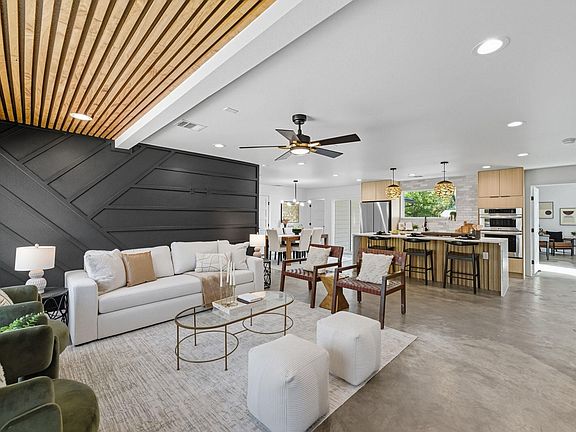 Designed for today's dynamic living, this exceptional 4-bedroom, 3.5-bath property offers incredible versatility. A truly unique feature is the flexible in-law suite, located on the left side of the home. With it's own entrance, this independent living space includes a kitchenette fully equipped with stainless steel appliances, a private living room, its own bedroom, a dedicated laundry, and a full bath. A private sliding door gives the suite direct access to the courtyard, making it a perfect space for extended family or a long-term guest. Discover a stunningly modern kitchen equipped with a full suite of stainless steel appliances, it boasts an oversized island perfect for gathering and serving. Beyond the main cooking area, you'll discover a generous walk-in pantry with custom cabinetry for exceptional storage. A dedicated bar area completes the space, providing the perfect spot for crafting cocktails or setting up a coffee station. This kitchen is truly designed for modern living and entertaining. The open living area flows seamlessly to a central courtyard with a built-in kitchen including a gas grill, and a mounted TV—the ultimate space for game days and al fresco dining. A separate backyard provides additional green space perfect for gardening. With easy access to major highways, commuting is simplified, whether heading into the heart of the city or exploring the broader Texas landscape. The neighborhood itself is rich with local amenities and attractions, from Mueller Lake Park's tranquil green spaces and community events to a variety of local eateries and shops that reflect the area's dynamic cultural mix.