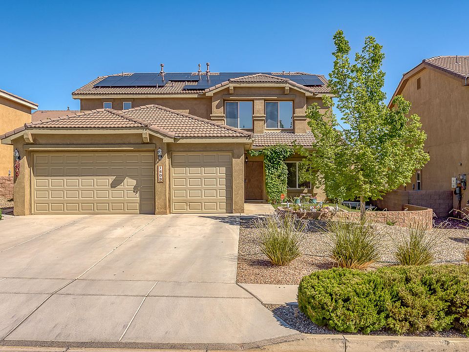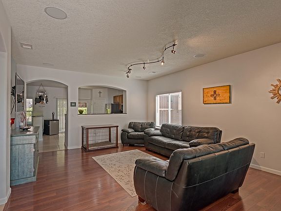 Welcome to this spacious well cared for 5 bedroom 4 bath home with master on main floor, This home offers 3 car garage, open kitchen with granite counter tops and newer stainless steel appliances, large kitchen opens to a eating area with a cozy gas fireplace. The main living area is great for movies with built in surround sound .The extra large upstairs loft is great for entertaining/game room experience. The 4 spacious bedrooms upstairs offer large closets and double sinks in both bathrooms. The backyard has a covered Gazebo with privacy and a waterfall to entertain with the beautiful New Mexico Sunsets. This home has it all to include walking distance from the Newly built Tres Volcanes Community Collaborative School. Solar Panels and much more. Call today for a showing.