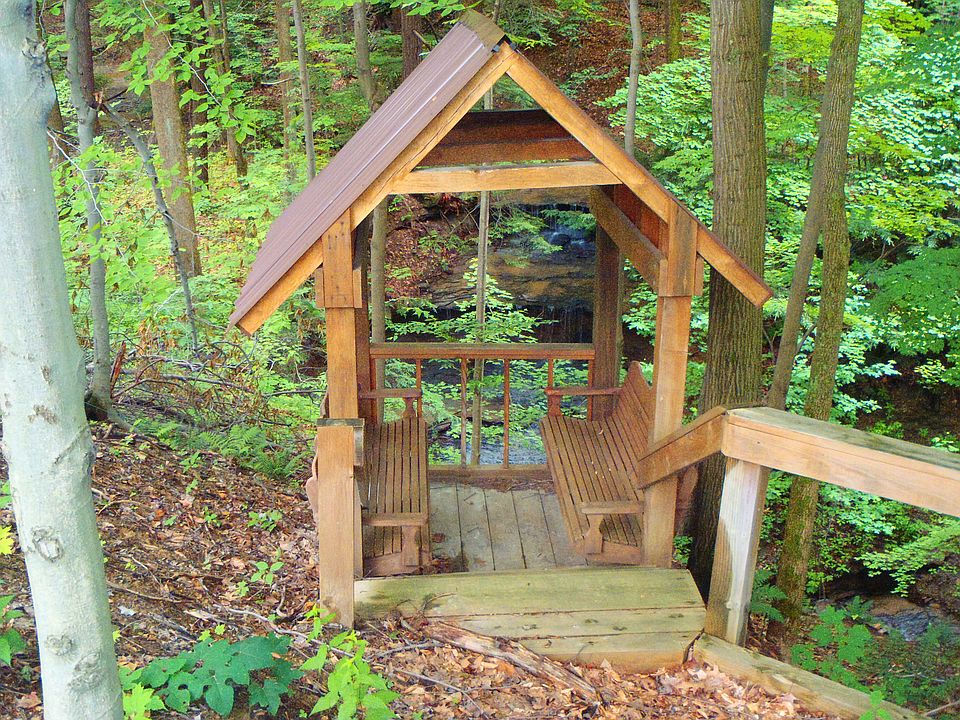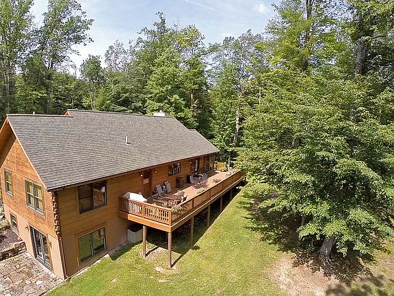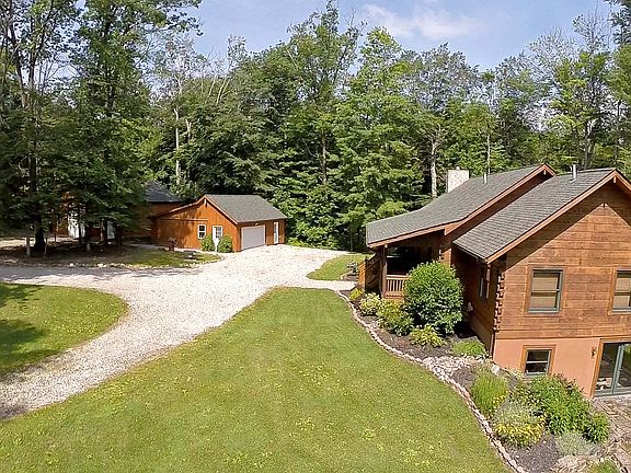 Montana Lodge Style Custom Log Home privately located almost 1,800 ft back off the road on 11.5 acres with stocked pond, waterfalls and ravine. Enjoy gorgeous views of nature & wildlife from 2 covered porches and an expansive sunny 52 ft rear deck. Waterfall views from the gazebo. This home is enhanced by warm woods and beams throughout! An open floor plan perfect for entertaining includes a vaulted great room with floor to ceiling stone fireplace, a kitchen with abundant premium hickory cabinetry and all appliances; a delightful Sun Room with fire pit; 12x12 heated den. Outbuildings include an oversized 2+ car garage and an amazing 40x30 pole building with mechanic/car lift and plenty of overhead fluorescent lighting -- a perfect space for the car buff. The lower level features a exercise room and additional full bath. This entire home is in impeccable condition and move-in ready!