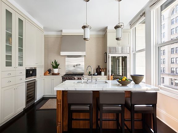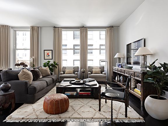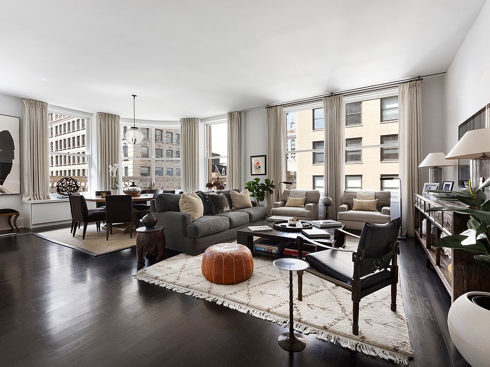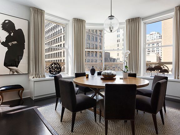 This coveted corner 2 bedroom, 2.5 bath loft seamlessly blends prewar grandeur with modern, top-of-the-line finishes and custom details creating a truly special home in the former Merchant's Bank of New York, located in the heart of Flatiron. Through the foyer, enter the elegant 1,766 square foot residence. The impressive scale of the great room is accentuated by 10.5 foot ceilings and 8 oversized windows that wrap around the large living space. The curved plate glass bay window creates an inviting dining space fit for formal or casual entertaining. Dramatic espresso-stained, wide-plank oak floors run throughout. The English style open kitchen is outfitted with hand-painted cabinetry, a walnut and marble island with breakfast bar, fully-vented 6-burner Wolf range, glass door Sub-Zero fridge, an additional Sub-Zero wine fridge and Miele coffee system. Enjoy the calm indoors and your own private wing with the ideal split bedroom layout. The gracious primary suite features two large closets, including one walk-in built out with custom shelving and drawers. Luxuriate in the tranquil en-suite bathroom with an oversized Waterworks freestanding tub, stall shower, double vanity, mosaic marble floors and Waterworks fixtures. The second bedroom is also generously proportioned and serviced by another full marble bath. Additionally, there is a powder room right off the foyer, as well as an alcove with beautiful, custom-built bookshelves that was previously a home office and could easily be converted back. Additional conveniences include a washer/dryer, central A/C, built-in sound system and motorized shades throughout. Built in 1897, this Beaux Arts classic with a unique curved facade, copper cupola and terra cotta detailing, was converted to a boutique loft condominium with 24-hour doorman, live-in superintendent, and gorgeous roof terrace. Located in the center of Flatiron, you are surrounded by landmarks like the Ladies Mile Historic District, Madison Square Park, Union Square Park, and some of the best restaurants, shopping and entertainment the city has to offer.