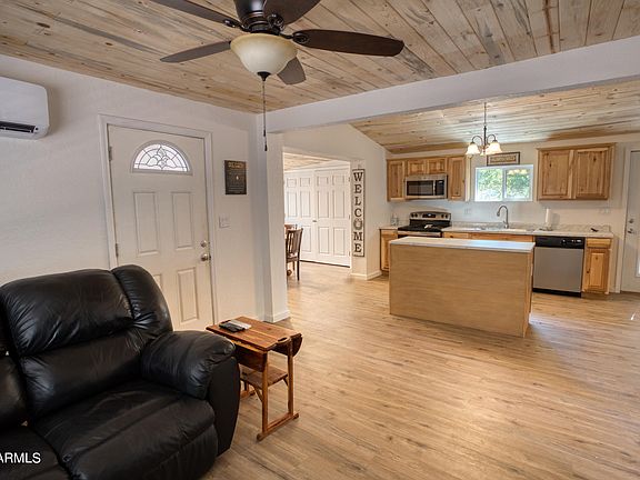 This sweet home on a quiet street has been totally remodeled from top to bottom, taken all the way down to the stud walls and floor joists! New drywall, wiring, plumbing, paint inside and out, fixtures, windows, doors, and more! Quality updates also include tongue 'n groove ceilings, attractive easy-care flooring, a beautiful kitchen with vaulted ceiling & an island, a large and lovely bathroom, nice appliances, and minisplits for economical heat and AC. Formal dining room could readily be transformed into a second bedroom, if so desired. Exterior amenities include a spacious 800 s.f. garage with workshop area that was built in 2005, and back yard fencing. Home sits high, with distance views. Versatile property would make a wonderful rental, part time get-away, or year-round home!