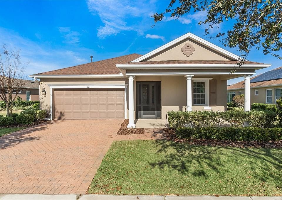 Multiple Offers Received! Calling for Highest and Best by 5pm today Sunday 2/26/2023. Welcome home to the highly sought-after, resort style 55+ community of Trilogy in Groveland. Relax and enjoy your maintenance free lifestyle in this beautiful, Larkspur Model, Shea solar home featuring Wood-look Ceramic Tile, Crown Moulding and 5 inch baseboards throughout. This home boasts an open floor plan with plenty of natural light overlooking a gorgeous screened in lanai with cascading sliding doors, an expansive living room and dining room that flow beautifully into the gourmet kitchen that was designed for entertaining. Your gourmet kitchen features granite countertops, 42-inch custom solid wood cabinets with crown molding, under-cabinet lighting, custom backsplash, gas range, gourmet appliances, eat-in bar and adjacent dining room. The smart space room is just off the kitchen and features a washer, dryer, desk and sink, while additional built-in cabinets and counters provide for an office space or hobby room. The master suite is highlighted by an elegant entry that leads to the spacious master bedroom with plenty of natural light and peaceful views of the backyard and sprawling greenspace. The grand en-suite features His & Hers vanities with granite countertops, custom solid wood cabinetry, glass enclosed walk-in shower, water closet, linen closet and large walk-in closet. The beautiful guest bedroom features a full-size closet, plenty of natural light and is large enough to accommodate a king size bed. This beautiful home also features a bonus/flex room that may be utilized as a den, office, media or game room and can easily accommodate a sleeper sofa. The home is energy efficient with solar, double pane Low-E windows and radiant barrier in the roof and is centrally located between Disney, Coco Beach and Tampa. The HOA fee includes cable TV, internet, home phone, security monitoring, lawn and shrub maintenance, guard gated front entrance and clubhouse amenities. You are sure to find plenty to do as you drive up to the 57,000-square-foot clubhouse, Magnolia House, with a full-service restaurant and bar, fitness center, hot tubs, luxurious indoor/outdoor community pool, tennis, pickleball, bocce, demonstration kitchen, art studio, walking trail and numerous other amenities. For those interested in this 55+ community, please be aware the community has not reached the max 20% of residents under 55 permitted. The community allows residents between the ages of 45 to 54.