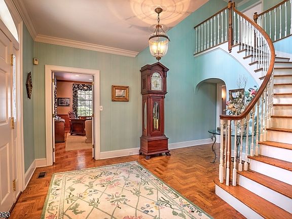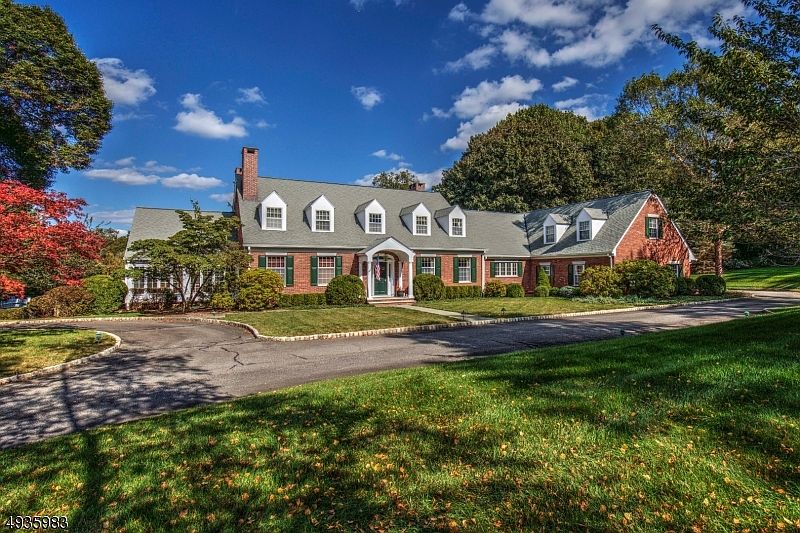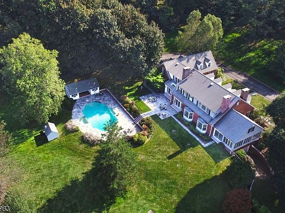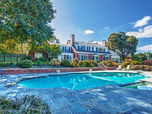 Spectacular Estate on the Bernardsville Mountain Embracing the warmth and spirit of Williamsburg architecture, a custom-built, all-brick estate is nestled on 5.42 acres of privacy in one of the Bernardsville Mountain's most popular neighborhoods. A sun-filled open floor plan of 12 rooms offers five bedrooms, three full and two half baths. Outdoor amenities include a heated pool with integrated spa and cabana, bluestone terraces, a pond for row boating or ice skating, and two storage barns which are perfect for housing a car collection. Highlights of the graceful layout such as oak hardwood floors, traditional moldings, custom built-ins, four fireplaces, two wet bars, recessed lighting and high ceilings are among the exceptional architectural details. Approached by a paved circular drive accented by granite block curbing, a bluestone front walkway leads to the covered entrance door featuring a leaded glass elliptical window and sidelights. Introducing this welcoming home is a two-story foyer designed with a serpentine staircase and herringbone patterned oak flooring. Flanking this entry are formal living and dining rooms. The visually stunning living room contains two bay windows, crown moldings and a fireplace artfully centered between arched built-in display cabinets. In the dining room, fine embellishments include dimensional wainscoting, crown and chair rail moldings, while herringbone-patterned oak floors lend interest underfoot. A handsome cherry paneled library contains a fireplace and wet bar as well as pastoral views of the property. Manicured grounds are framed by three window walls in a sun-splashed conservatory offering a sliding door to the outside. Oversized and filled with natural light, an inviting center island kitchen is designed with white cabinetry, oak floors, paneled appliances and custom tilework. The adjacent breakfast room has an airy skylight, rear staircase to the bedroom level and French doors opening to the bluestone terrace for outdoor meals. Nearby, the beamed ceiling family room's focal point is a raised hearth stone fireplace, while an entertainment-friendly wet bar and full wall of custom built-ins are additional amenities. Completing the first floor are two powder rooms and an extra-large laundry room lined in crisp bead board paneling. Upstairs, a master suite begins in the oversized bedroom, a serene fireside retreat offering two walk-in closets. The master dressing room with sink vanity adjoins a renovated master bath containing a stand-alone soaking tub, clear glass door shower and upgraded vanity. Four additional bedrooms and a computer room share two more full baths on this level. Additional living space has been created in the basement's carpeted recreation room with painted walls and an exercise room. This level also includes a huge storage room and garage. Two barns on the property have wood floors, electric service and offer multiple uses including vehicle storage. Open, level and gently rolling acreage is enhanced by stacked stone walls, mature trees and serene countryside panoramas. Additional amenities include a central vacuum system, deer fencing and an outdoor sprinkler system. This sought-after location on the Bernardsville Mountain is close to downtown Bernardsville for Midtown Direct train service, restaurants, shops, public and private schools as well as world class golf and equestrian facilities. Commuters will appreciate Bernardsville's easy access to Interstates 78, 287 and Newark Liberty International Airport.