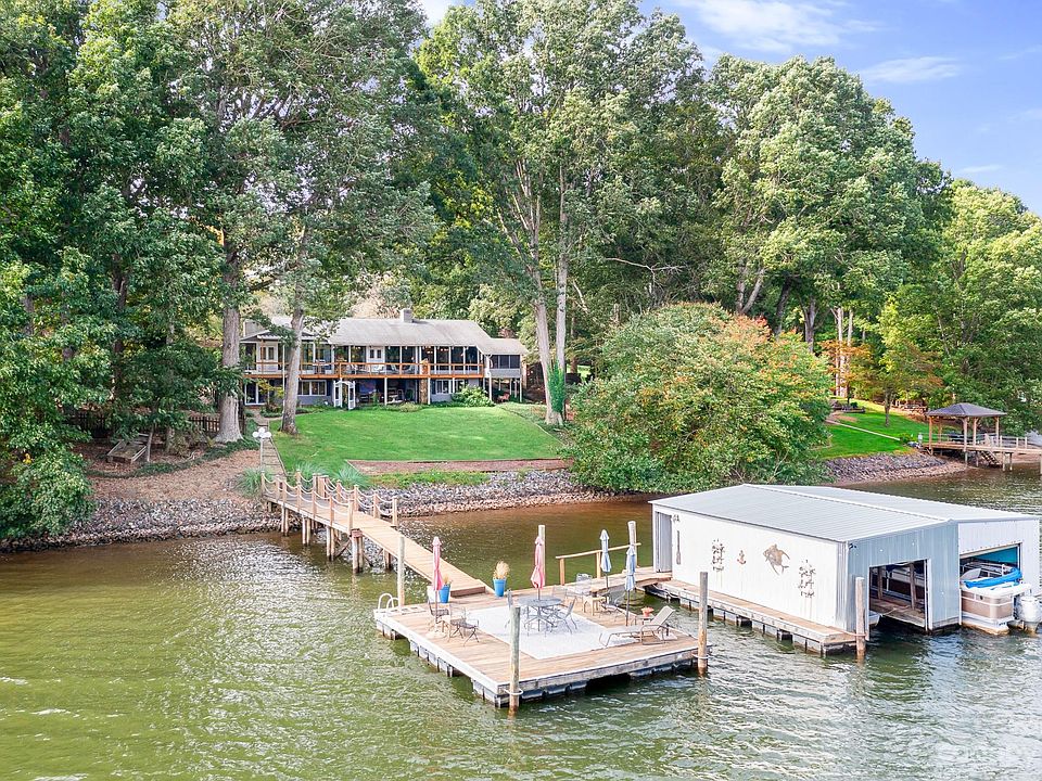 Located near Lake Norman State Park, this waterfront home has expansive water views and offers a private setting. There is 135 ft. of shoreline with deep water at the Boat House which includes 2 boat slips and a floating dock to enjoy fishing or relaxing lake side. This one-story home with a basement includes 3 bedrooms, 3 full baths and offers a see-through stacked stone, wood burning fireplace that graces both the kitchen and the great room, adding warmth and charm to your living spaces. The Kitchen details include double ovens, electric cooktop and pantry with accordion-style doors, providing ample storage space. Primary bedroom features a gas fireplace with access to the deck. Basement has a gas fireplace, entertainment and flex area with hot tub. In addition, there is a screened-in porch, an updated deck, and a heated/cooled workshop which is a perfect space for DIY projects or storage. Don't miss the opportunity to make this Lake Norman property your own. No HOA. Home Sold As Is.