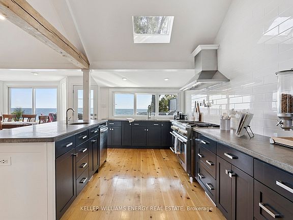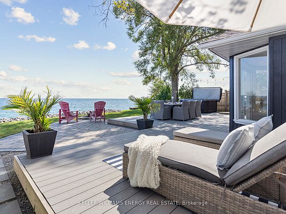 Awaken to sweeping views of Lake Ontario from this elegant waterfront bungalow, set on a rare 300-ft-deep lot with over 40ft of private lakefront. The vaulted great room features a stunning floor-to-ceiling stone fireplace, cathedral ceilings, and 12-ft sliding glass doors all connecting seamlessly to the expansive lakeside TREX decking. A chefs kitchen complete with Thermador appliances, convenient pot filler, modern counters, elegant skylight windows, and a pass-through window, that truly bring the sound of waves crashing on the shoreline, inside. The primary suite offers a spa-like ensuite with heated marble floors, walk-in closet, and direct walkout to the deck. A separate wing includes a full second kitchen, family flex room with expansive sliding glass doors to the courtyard, a bedroom, and 3-pc bathideal for multi-generational living. The detached 2 car garage features an insulated loft apartment with a kitchen, 3-pc bath, fireplace, and walk-in closet. Landscaped grounds include a hot tub, exquisite French inspired gardens, and multiple outdoor living areas, all just minutes from downtown Bowmanville, Hwy 401, and under an hour to Toronto.