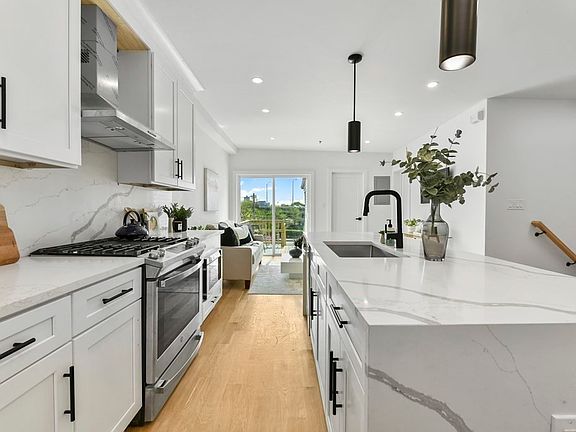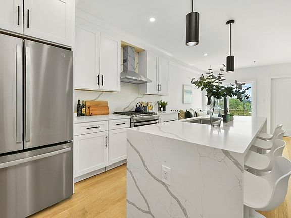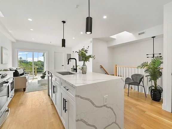 New 2023 Construction - Introducing the Residences at 141 Chelsea St! Experience convenient city living and neighborhood charm with this stunning, 2 bed 2 bath, penthouse condo in East Boston. This sun-drenched unit offers an inviting, open floorplan perfect for relaxing or entertaining guests. This designer kitchen features white shaker cabinets, stainless steel GE appliances, matte black accents/fixtures, elegant Calacatta Quartz countertops/backsplash and island with waterfall edges. Open your sliding door from the living room to access two private outdoor decks with views of the East Boston Greenway. Other features include a skylight, pale white oak hardwood flooring, recessed lights, central AC/Heat, one master en-suite bedroom, modern tiled bathrooms with LED vanity mirrors, W/D hookups and more! Settled between Jeffries Point, Maverick Square and Eagle Hill, residents can enjoy a Walk Score of 94 with proximity to MBTA Blue Line, wonderful outdoor parks and local restaurants.