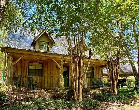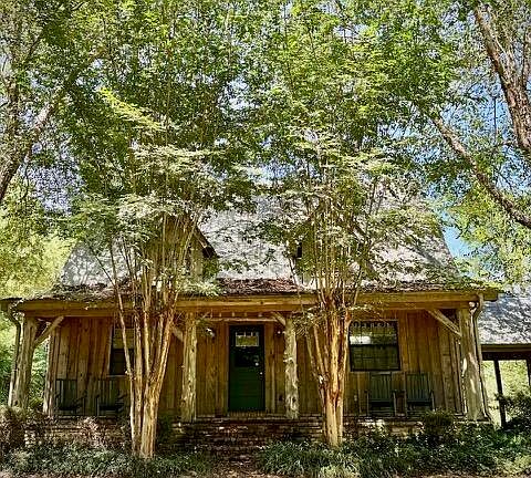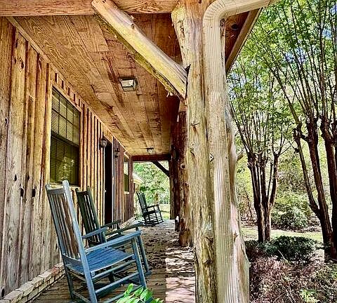 Tucked away down a winding private lane, this charming rustic-style home offers the perfect blend of privacy, peace, and natural beauty. Nestled on 16.78 acres of mature woods, this property is ideal for those seeking a quiet country lifestyle, complete with abundant wildlife and serene surroundings. The home features 3 spacious bedrooms and 3 full baths, offering approximately 1859 square feet of comfortable living space. The large den is the heart of the home, boasting a cozy fireplace, vaulted ceilings with exposed beams, and warm rustic charm throughout. The spacious kitchen provides ample cabinet space and flows seamlessly into the adjoining dining area—perfect for family meals or entertaining guests. Step outside to enjoy your morning coffee or evening unwind on the front and rear porches, where the sounds of nature surround you. A breezeway connects the home to a covered carport, maintaining the rustic aesthetic while offering functional convenience. The home is topped with a durable metal roof and designed to blend beautifully with its natural surroundings.