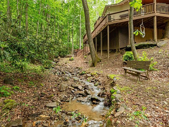 Desiring harmony with nature and the out of doors, the cascading creek delivers, as this is a buyer's dream mountain home, or getaway. Heat up the hot tub to rejuvenate and recharge. Relax on your screened porch to dine, read, or just enjoy nature. Walk down to your fire pit, or sit on the bench to listen to the soothing creek. Get cozy by turning on the gas log fireplace in the great room. Newly renovated bedroom on main level with a slider to the deck, along with separate bathroom, and updated kitchen. 2nd level offers a large loft bedroom with ensuite bath, walk-in closet, private balcony. and a multi-use 3rd bedroom. Outside find a carport and a new 2 car garage with floored attic storage. Sellers added over $200K in upgrades in the last 2 years, and will leave it full or partially furnished: just ask. Live here full time, or use it as an investment. Wooded double lot gives plenty of privacy, you're close to shopping and entertainment. Maggie Valley CC is walkable with golf, tennis, restaurant and more. All this and a home warranty.