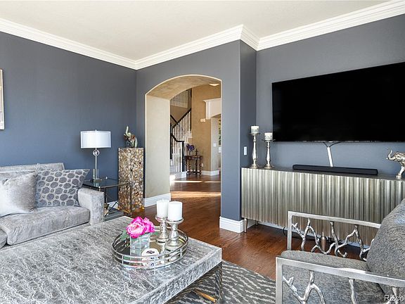 Beautiful Highwoods home centrally located in Highlands Ranch, this home offers easy access to C470, DTC and Downtown Denver. This custom home is located on a large lot at the end of a cul-de-sac backing to a greenbelt with walking path and offers beautiful Mountain Views. Grand Entry with spiral staircase welcomes you as you enter into this lovely home featuring refinished hardwood floors. Main floor features formal living room and dining room as well as a main floor study, family room, updated eat in kitchen, mudroom/laundry and butler's pantry. Eat in kitchen with large center island with seating, showcases painted cabinets, stainless steel appliances, gas cooktop, built in desk, and spacious nook for informal dining. Open to the family room, you will love the new sliding door to the outdoor covered deck. Second level offers Primary Bedroom Suite with amazing mountain views, spacious sitting area with gas log fireplace and updated 5 piece bath as well as 3 additional secondary bedrooms and 2 more full baths. The finished garden level basement with recreation room is great for entertaining with walk up wet bar, new luxury vinyl plank flooring, 5th conforming bedroom, updated 3/4 bath and plenty of storage hidden behind the bookshelves. Outdoor entertaining has never been better. Enjoy all that Colorado has to offer on your expansive, covered deck featuring stone wall, TV, heaters, and outdoor fire feature. Relax with a glass of wine while you watch your favorite Denver sports team all while enjoying the beautiful Mtn views. Highwoods amenities include gated entry, private pool, tennis courts and play ground for residents while HRCA offers access to 4 recreation centers, parks, activities and miles of trails.
